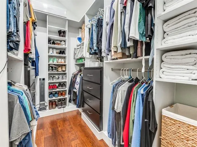 The spacious living room offers a contemporary ceiling fan and a cozy electric fireplace, perfect for relaxing evenings. The open-concept family room includes a built-in entertainment credenza and striking bamboo wall panels, seamlessly flowing into the incredible kitchen. Here, quartz countertops, a large eat-in island, and smart storage solutions—including pull-out spice racks, soft-close drawers (some with power hookups), and under-cabinet pull-outs—make everyday living effortless. A farm sink, subway tile backsplash, back-lit upper cabinets, designer hardware, electric cooktop, and built-in microwave complete this chef-inspired space.