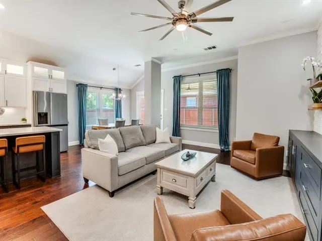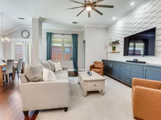 Welcome home to this beautifully designed corner-lot property boasting outstanding curb appeal and thoughtful upgrades throughout. A landscaped Austin stone flower bed frames the expansive front porch, creating a warm and inviting first impression. The exterior features a timeless blend of brick and Hardie siding, while inside you’ll find engineered hardwood floors, accent paint tones, and stylish modern lighting that elevate every space.