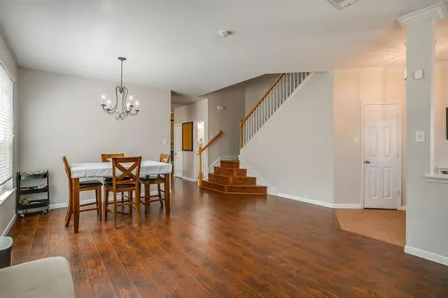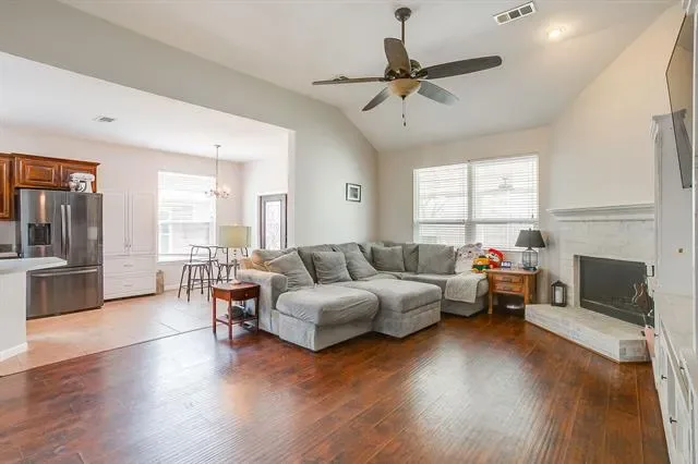 Welcome to 4220 Highgate Road, a beautifully maintained two-story home that provides everyday comfort and all the space you need. Boasting fantastic curb appeal with a classic brick and siding exterior, a welcoming covered front porch, and mature landscaping, this property is ready to impress from the moment you arrive. Step inside to discover a bright, open-concept floor plan highlighted by gorgeous wood-look flooring and abundant natural light. The inviting entryway flows seamlessly into a versatile formal dining or flex space, perfect for hosting gatherings. At the heart of the home is a spacious, well-appointed kitchen featuring rich, dark wood cabinetry, stainless steel appliances, and an oversized island with seating. The kitchen opens directly into a cozy breakfast nook and a spectacular living room, anchored by a beautiful white brick fireplace and elevated by dramatic vaulted ceilings.