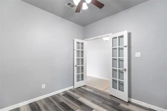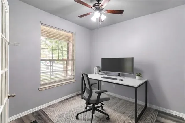 Step inside to an open-concept, split-bedroom floorplan with Luxury Vinyl Plank flooring throughout the main living areas. A dedicated office with French doors sits just off the entry. The living room features a decorative gas fireplace and flows seamlessly into the kitchen and dining areas.