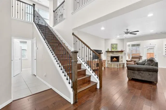 Straight ahead, the spacious living room features a charming brick and stone gas-start fireplace and opens seamlessly to the kitchen and breakfast area. Abundant windows fill the space with natural light and provide lovely views of the covered patio and backyard. The kitchen is well-appointed with ample cabinetry, granite countertops, and a large island ideal for gathering.