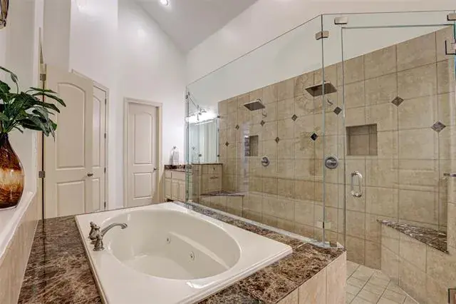 Retreat to the luxurious primary suite featuring a spa-inspired bathroom with dual vanities, an oversized soaking tub, and an impressive double shower designed for ultimate relaxation.