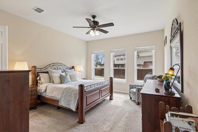 Nestled in the sought-after Heritage HOA master planned community, this beautifully maintained home offers extensive upgrades that enhance comfort, efficiency, and long-term value. Inside, the desirable floorplan features tall ceilings, plantation shutters, generously sized rooms, double staircases, and abundant custom storage with built-in shelving and cabinetry. The main level primary suite provides a serene retreat with granite vanities, a relaxing garden tub, and a spacious walk-in closet. A guest room with its own private full bath is also conveniently located on the first floor. The spacious kitchen is ideal for daily living and entertaining, offering ample cabinetry with pull-out drawers in all lower cabinets and the pantry, a coffee bar, center island, premium granite countertops, Bosch dishwasher, smart-touch faucet, and a new induction cooktop. Upstairs includes two oversized bedrooms—each with walk-in closets and a shared Jack and Jill bath—plus a large game room, a media room wired for 5.2 surround sound, and a bonus room with built-in cabinetry and desk perfect for study or crafting. The 3-car garage features upgraded polycuramine flooring for durability and a clean finish. The level, private backyard includes space for play or a future pool, along with a cedar-covered patio with ceiling fans, outlets, and canned lighting for year-round enjoyment. Major updates include a new first-floor AC and furnace, landscaping with new trees, stone edging and pavers, a Low-E back door and new energy-efficient windows, two new hot water heaters with recirculating system, a Class 4 hail-resistant roof, smart Wi-Fi thermostats, a Hunter Wi-Fi irrigation controller, surge and lightning protection, updated lighting, and more! Enjoy Heritage’s amenities—7 pools, splash park, fitness center, clubhouse, playgrounds, volleyball, tennis and pickleball courts, miles of trails, HOA events, Keller ISD schools, and a prime location near shopping and dining.