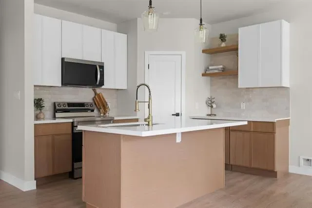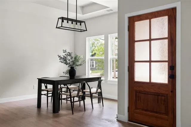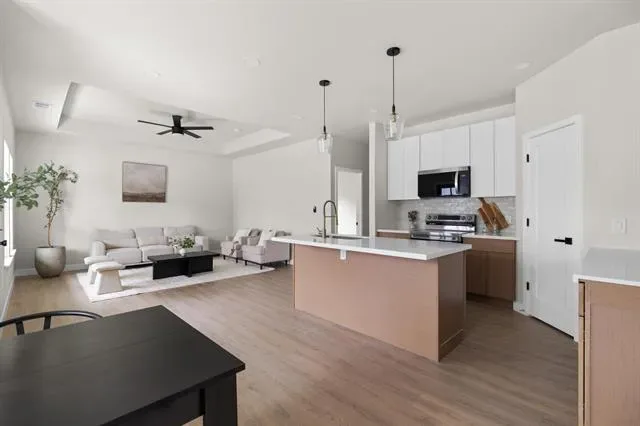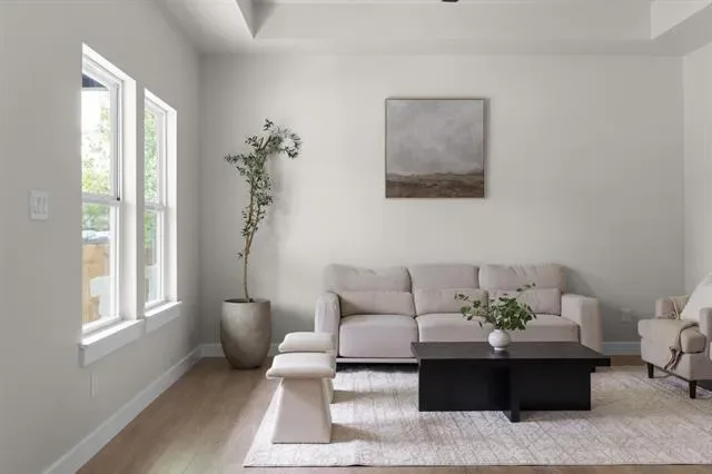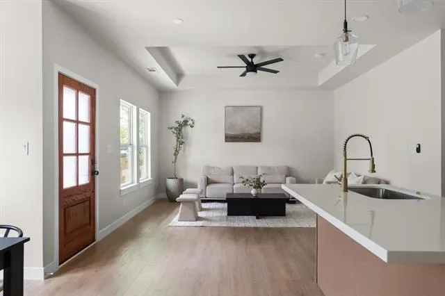 Step inside to an open-concept layout filled with natural light and a seamless flow perfect for both everyday living and entertaining. The living space is thoughtfully designed with a clean, modern aesthetic, highlighted by a tray ceiling, designer lighting, and a calming neutral palette.