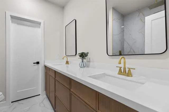 Retreat to spacious bedrooms designed for comfort and simplicity, while the bathrooms offer a spa-like feel with elevated finishes and attention to detail. The master bedroom features an accent wall, adding depth and character to the home’s modern design.