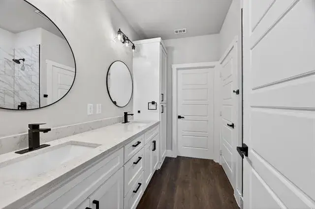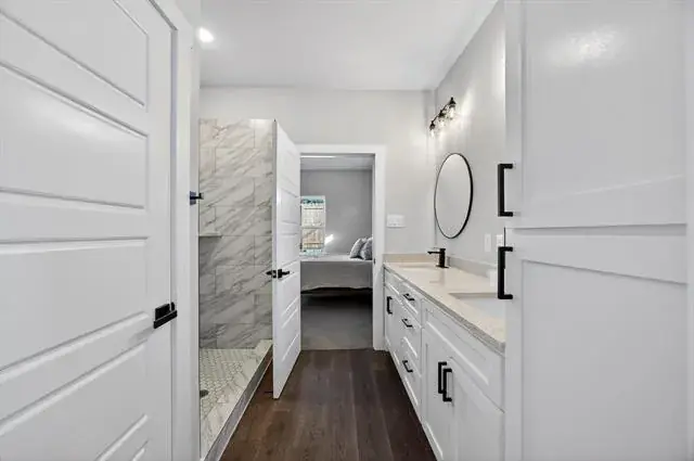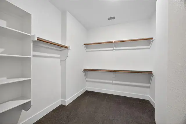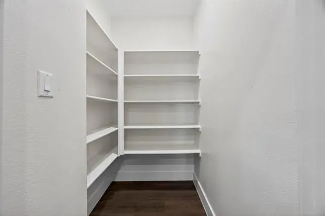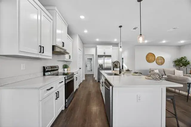 The chef inspired kitchen includes quartz countertops, a large island, abundant cabinetry, and a deep walk in pantry with lighting. The open layout keeps the kitchen connected to the main living area while maintaining defined spaces.