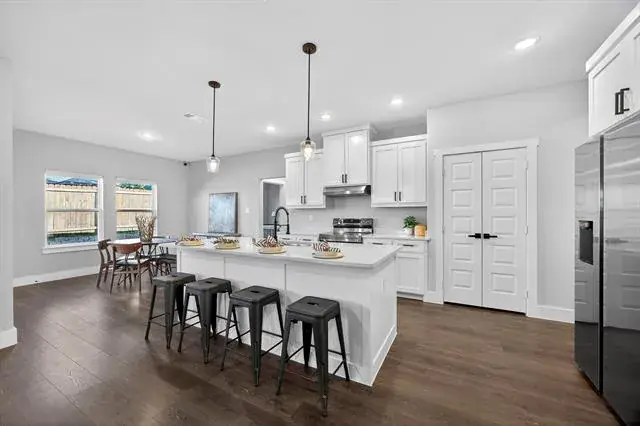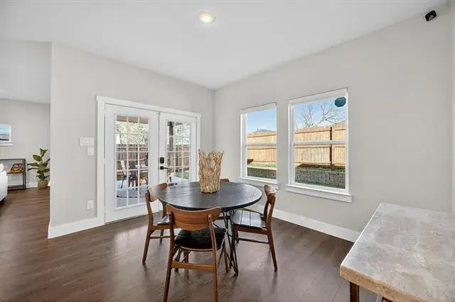 This modern open concept home offers a spacious layout filled with natural light and designed for both entertaining and everyday living. The large dining room features double French doors that open seamlessly to a covered back patio, creating true indoor outdoor flow and an ideal entertaining space.