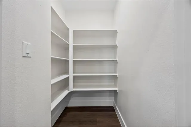 The chef inspired kitchen includes quartz countertops, a large island, abundant cabinetry, and a deep walk in pantry with lighting. The open layout keeps the kitchen connected to the main living area while maintaining defined spaces.