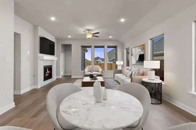 MLS# 20916591 – Built by Coventry Homes – Const. Completed Nov 28 2025 ~ Step into style and comfort with this stunning 4-bedroom, 2-bath home featuring a dedicated study and over 2,000 sq ft of living space—designed to be the perfect fit for modern living. From the moment you arrive, the 8-ft, 6-panel wood and glass front door welcomes you with warmth and charm. A dramatic 12-ft pan ceiling sets the tone for the expansive open floorplan, where luxury vinyl plank flooring flows seamlessly through the great room, open kitchen, and dining area. Gather around the cozy fireplace or unwind beneath the stars on your covered back patio—ideal for quiet nights or entertaining guests. With neutral tones throughout, this home is elegant and offers timeless appeal for any style. A true shopper-stopper that won''t last long—don’t miss your chance to see it today!
