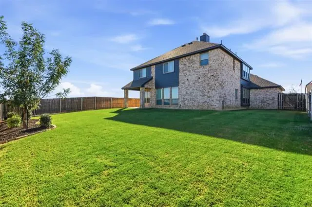 Outdoors, enjoy the covered patio overlooking a lush green backyard—perfect for barbecues, playtime, or relaxing evenings. The home’s curb appeal shines through with professional landscaping, a stone façade, and a three-car garage that enhances both style and practicality.
