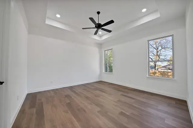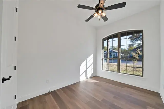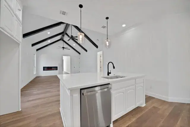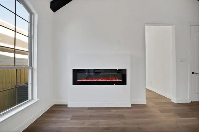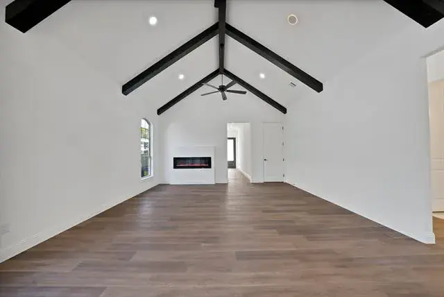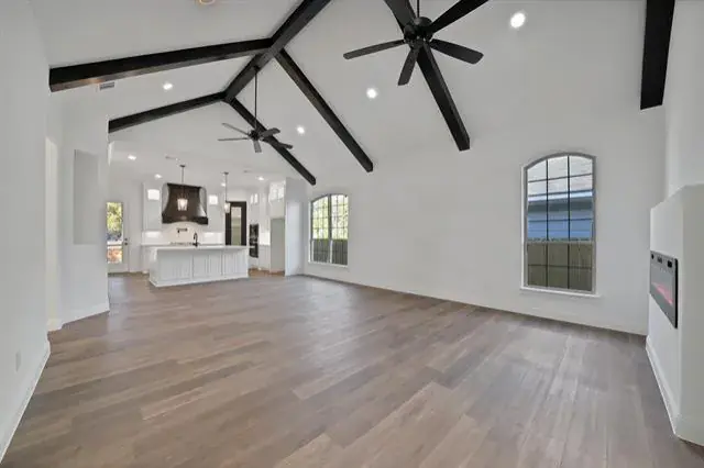 Beautiful 2025 modern farmhouse just 10 minutes from Downtown Fort Worth! This brand-new home offers 1,712 sq ft, 4 bedrooms, 2 bathrooms, and a bright open layout with vaulted ceilings and exposed beams. The living area features a sleek electric fireplace and large windows for natural light.
