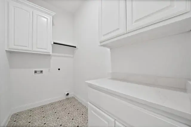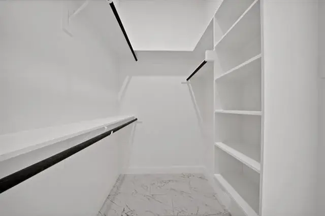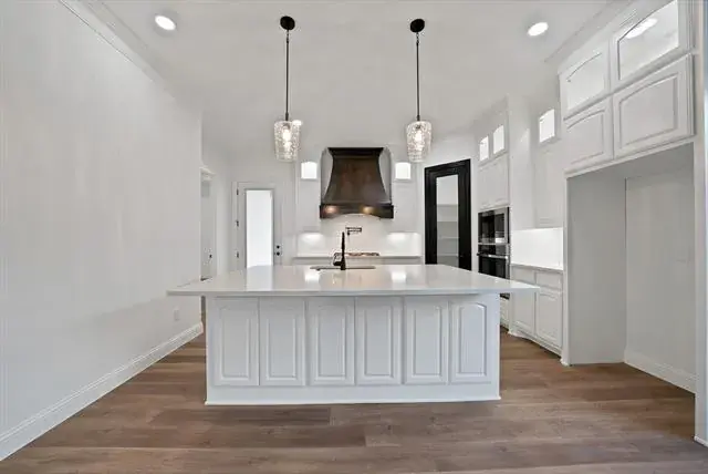The gourmet kitchen includes an oversized island, quartz counters, custom cabinetry, pendant lighting, a 5-burner gas cooktop with pot filler, and integrated microwave and oven. The spacious primary suite features a walk-in shower with marble-style tile.