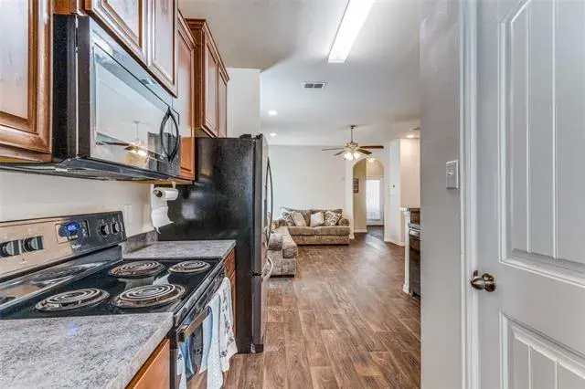 The primary suite features a generous layout with an ensuite bathroom offering double sinks, a soaking tub, and a separate walk-in shower. Two additional bedrooms are privately situated toward the back of the home and share a full hallway bath, providing comfort and privacy. The garage currently includes a temporary wall, creating two flexible bonus spaces with heat and air already in place. These versatile areas are ideal for a craft room, home gym, hobby space, home office, or additional bedrooms, while still allowing for easy conversion back to a traditional garage if desired. Situated on a low-maintenance lot with a private driveway, this property offers both convenience and functionality. Ideally located just minutes from downtown Fort Worth, the historic Stockyards, and major highways, this home provides easy access to shopping, dining, schools, churches, and entertainment. A perfect opportunity for homeowners or investors seeking a move-in ready property in a prime location.