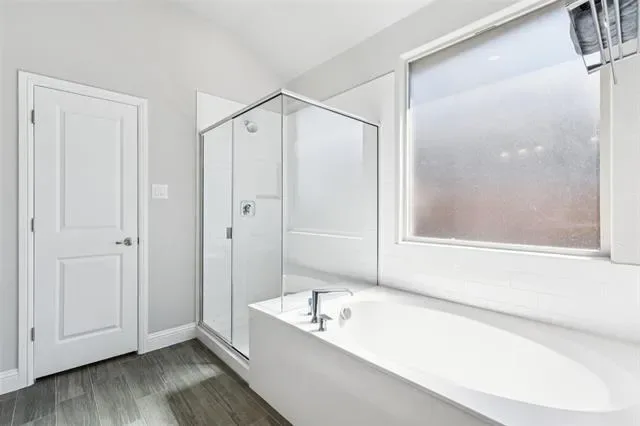 The private primary suite is thoughtfully separated from the secondary bedrooms and features a tray ceiling, a spacious walk-in closet, and a spa-inspired ensuite bath complete with an oversized walk-in shower and a deep soaking tub—perfect for unwinding after a long day.