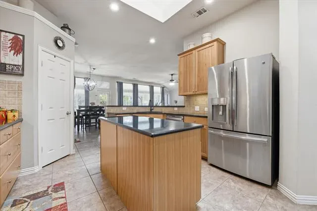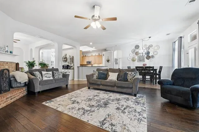 The open-concept living area is filled with natural light and anchored by a cozy fireplace, creating a warm and inviting space for both everyday living and entertaining. The oversized kitchen is a true centerpiece, featuring elegant granite countertops, abundant cabinetry, a large island, and a gas cooktop—perfect for home chefs and gatherings alike.