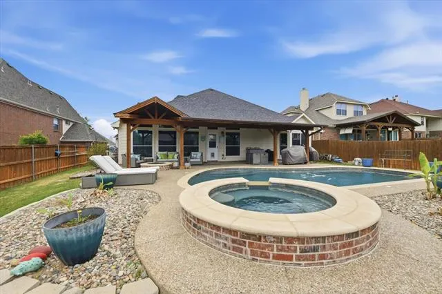Step outside to your own backyard oasis, complete with a sparkling chlorine pool and heated hot tub for year-round enjoyment. The outdoor area also features a fire pit near the pool, creating a cozy setting for evenings with family and friends.