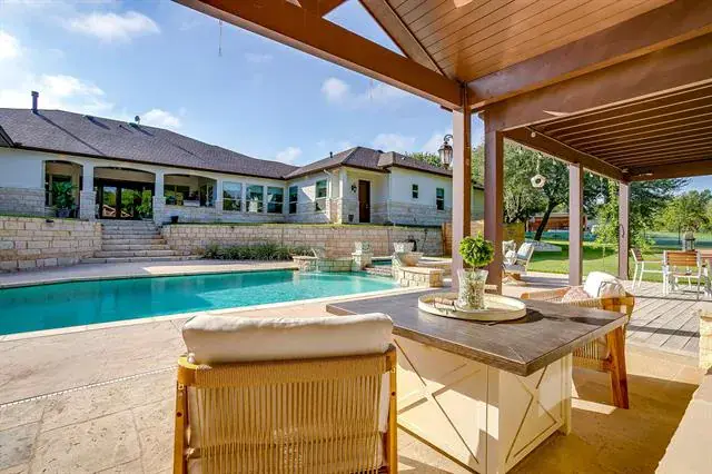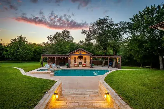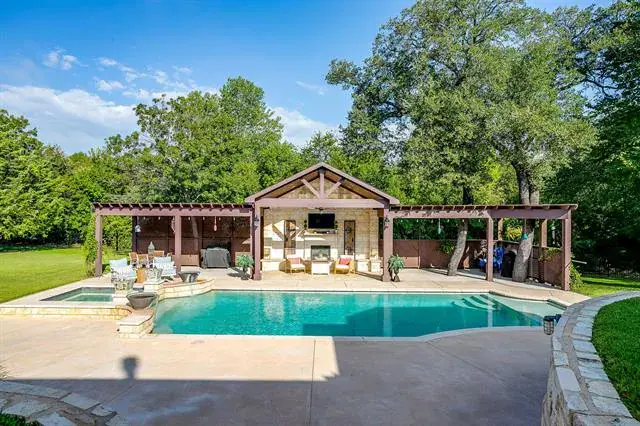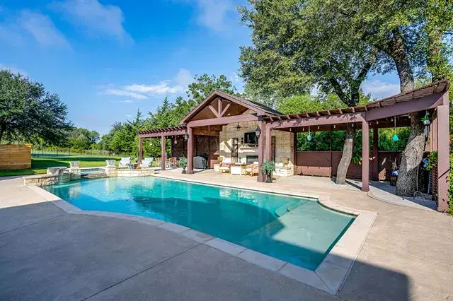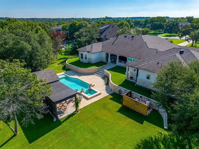 Nestled within the prestigious community of La Cantera West, this Mediterranean-inspired residence offers a refined blend of elegance, comfort, and functionality. From the moment you step inside, you are greeted with expansive windows that frame captivating views of the backyard oasis, filling the home with natural light and creating a seamless connection between indoor and outdoor living. Designed with both entertaining and everyday living in mind, the layout features a formal dining room, butler’s pantry, gourmet kitchen, spacious breakfast area, and an inviting family room—perfect for gatherings of any size. The chef’s kitchen offers abundant counter space and custom cabinetry, setting the stage for both casual meals and formal celebrations.The primary suite is a serene retreat overlooking the picturesque backyard, complete with a spa-like bathroom featuring dual vanities, a large walk-in shower, garden tub, and a custom-designed closet that combines function with sophistication. Additional highlights include a large private office ideal for today’s professional, plus two generously sized bedrooms with en-suite baths—one with its own private wing and living area. Rich woodwork details on the living and study ceilings add timeless warmth and craftsmanship. The exterior continues to impress with a porte cochere leading to a private guesthouse with full bath, offering the perfect space for visitors or extended stays. Outdoor living takes center stage with a cabana designed for entertaining, complete with built-in BBQ, Big Green Egg, and ample room for gatherings. The sparkling pool and tranquil setting further enhance this entertainer’s paradise. Perfectly located less than 30 minutes from Lockheed Martin and Downtown Fort Worth, this exquisite estate embodies the ultimate balance of luxury, privacy, and convenience.