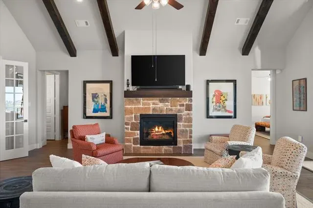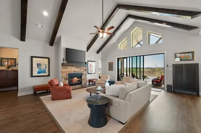 The main living space is open with vaulted, beamed ceilings, a fireplace, and an amazing view. The large glass sliding doors open with space and ease, allowing for seamless indoor outdoor living and entertaining.