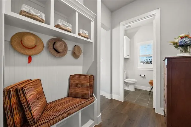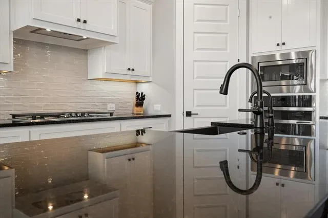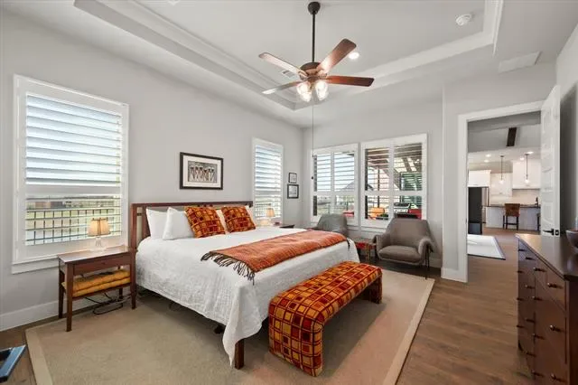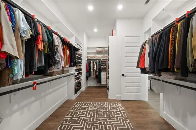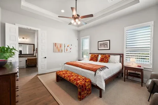 The primary suite is comfortable and well-executed, with walk-in shower and substantial closet. A private office with French doors, a guest room with en-suite bath, and a powder room round out a layout that’s both functional and flexible. Additional highlights include a Versa Lift in the garage for easy-access storage.