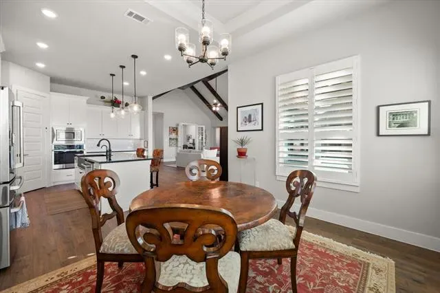 A large island with ample space to gather, cook, and entertain grounds the kitchen. A spacious pantry and ample cabinetry make this an enviable kitchen for any in-home chef. A wonderful dining area full of windows provides views to the pond.