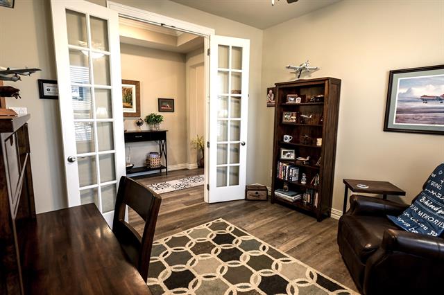 An impressive 8 foot front door opens to a wide entry, wood flooring through main living areas, carpeted bedrooms, and ceramic tile in wet spaces. The private study with French doors offers flexibility for work or hobbies. Tray ceilings, recessed lighting, and a gas fireplace with wall switch enhance the open living area, and the home is wired for surround sound.