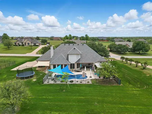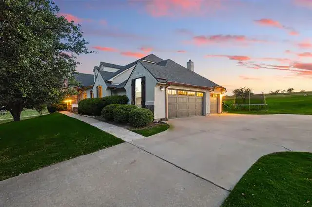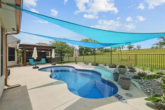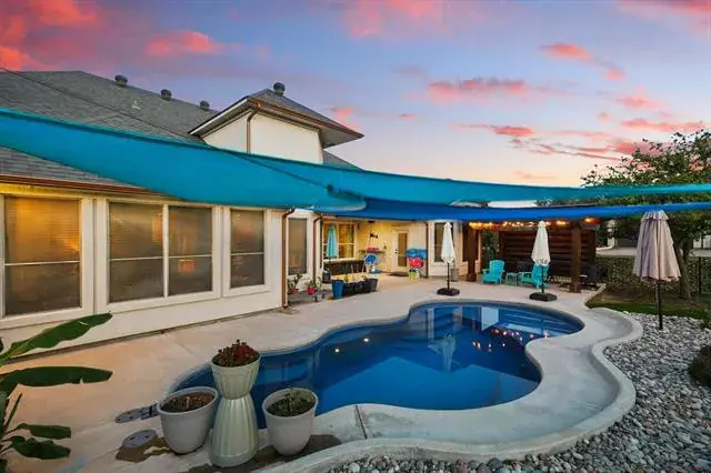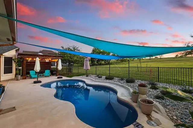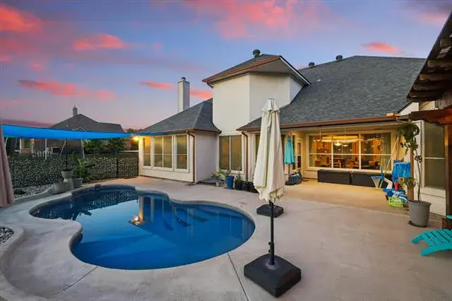 Outdoors, the backyard is made for enjoying North Texas living. A saltwater pool invites you to cool off on warm days, while the covered patio and pergola create the perfect setting for slow mornings or evenings spent taking in the scenery. As the sun sets, the sky puts on a show, offering beautiful views that make every evening feel special. With room to roam and space to play, the yard offers both freedom and function.