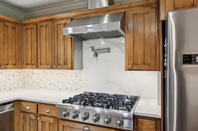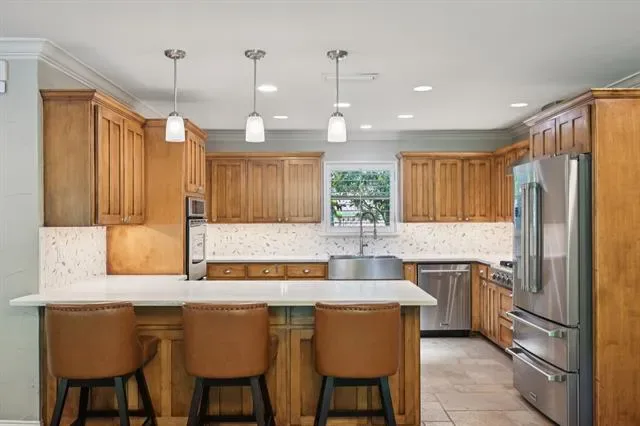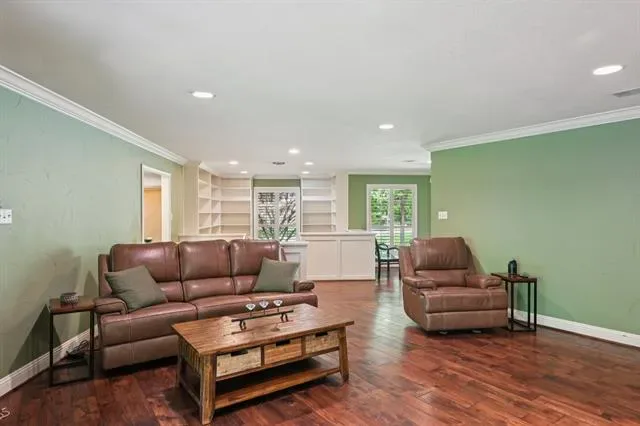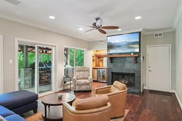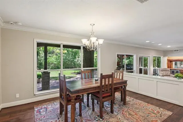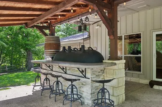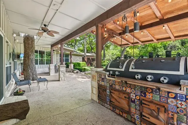 Beautifully updated single-story home situated on a tranquil, treelined creek lot, offers 4 bedrooms and 3 full baths with a highly functional layout designed for elevated everyday living and exceptional entertaining. Multiple living spaces include two spacious family rooms, each with its own fireplace, a dedicated dining area off the kitchen, and a charming library nook with built-in bookshelves. The 2024 updated kitchen serves as the heart of the home, showcasing quartz countertops, coordinating backsplash, stainless steel sink, upgraded faucet, and premium Thor appliances including a 6-burner cooktop with pot filler, dishwasher, and refrigerator. The home also features a well-appointed mini bar complete with refrigerator, ice maker, and sink, ideal for hosting with ease. Engineered hardwood flooring extends throughout most of the home, with tile in the kitchen and bathrooms. The primary suite offers a relaxing retreat with dual sinks, a separate garden tub, and updated walk-in shower. Step outside to an extraordinary secluded and private backyard oasis designed for true outdoor living featuring a large, covered patio plus an expansive open patio space, a fully equipped outdoor kitchen with gas grill, charcoal grill, smoker, 2-burner cooktop and a sink. The generous size backyard includes a play area with a wooden play set. Perfectly suited for entertaining on any scale, this property delivers a rare combination of comfort, function, and the ultimate setting for gathering, entertaining and making memories. Major improvements include roof replacement in 2022 and hot water heaters updated in 2023 and 2024. This sale includes LOT A1D, Lake Country Estates Addition which adds .43 acres making the combined lots size 1.07 acre. The HOA is voluntary, but if you choose membership, it offers a community park, pickle ball court, tennis court and access to a boat launch. TV’s will remain with the home.