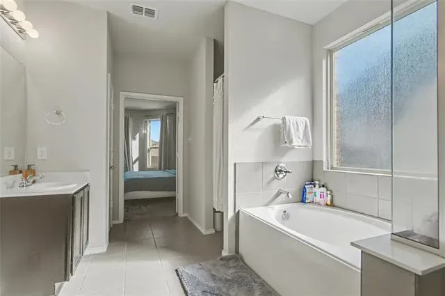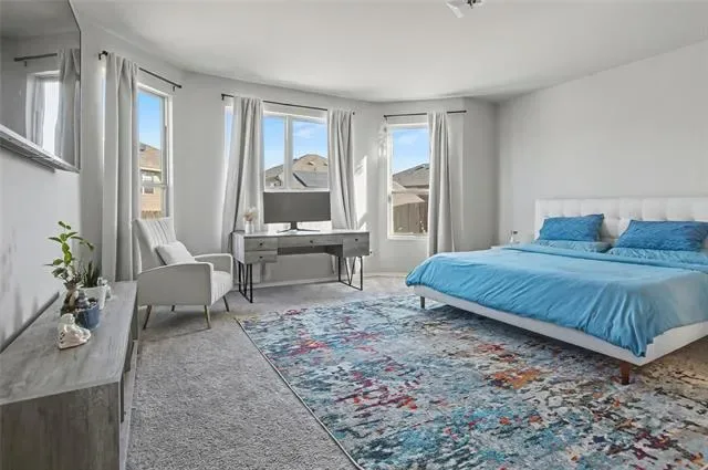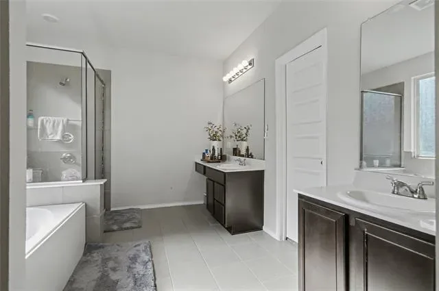 The downstairs owner’s suite includes a bay window and an ensuite bath with dual sinks, a tiled garden tub, and a separate tiled shower. The open-concept kitchen and living area create an ideal space for hosting and gathering.
