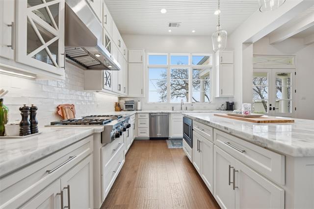 Experience refined lakefront living on nearly one acre of prime waterfront with private dock and lift, designed for both full time enjoyment and the ultimate weekend escape. This custom luxury home, built by a highly respected builder, blends craftsmanship, comfort, and panoramic open water views. Inside, you will find three bedrooms and three and a half baths, all enhanced by beautiful wood flooring and thoughtful architectural detail. The gourmet kitchen is a showpiece, featuring marble countertops, commercial grade gas cooktop, double ovens, and abundant workspace for effortless entertaining. Expansive windows frame the lake and flood the open concept living, dining, and kitchen areas with natural light, creating a seamless indoor outdoor experience. The owner’s suite is a private retreat with a custom closet, dual vanities, and a luxurious soaking tub. A secondary downstairs bedroom with ensuite bath offers ideal privacy for guests. Upstairs, a spacious second living area includes a beverage bar and beverage refrigerator, along with a large bunk room complete with built in double bunks and a full bath, perfect for hosting family and friends. An oversized garage provides generous storage for vehicles and lake toys. Step outside to a large covered porch with outdoor kitchen and grill area, ideal for sunset dinners and relaxed gatherings. The private boat dock with lift offers direct access to open water and endless days on the lake. If you have been searching for exceptional waterfront living with space, quality, and unforgettable views, this property delivers. Schedule your private showing today and start living the lake life you have been dreaming about.