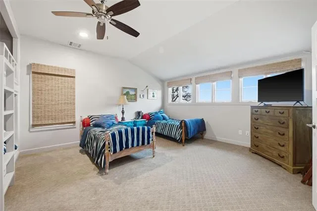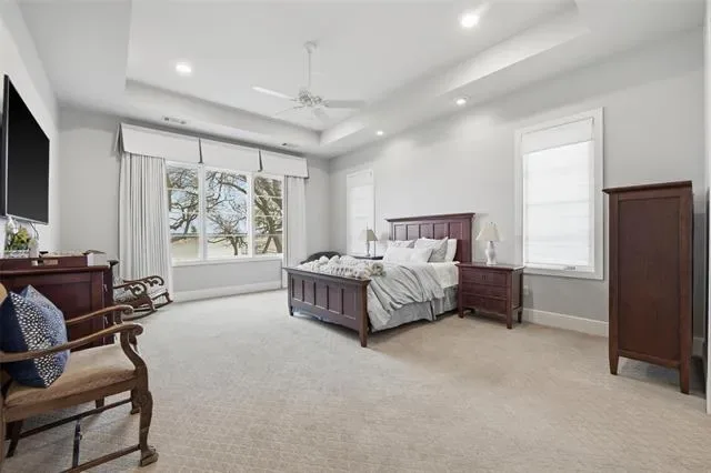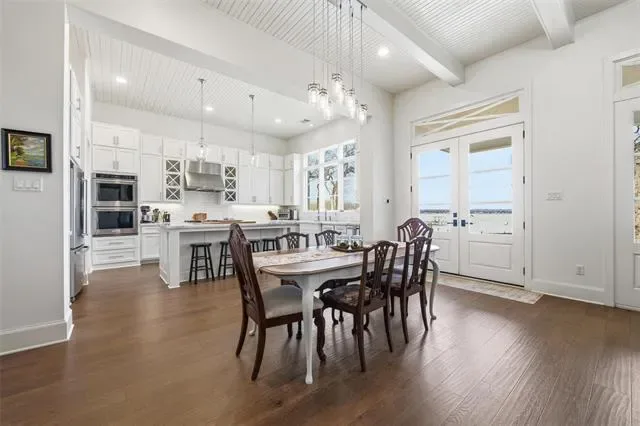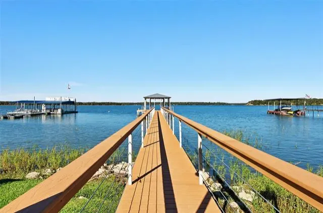 Experience refined lakefront living on nearly one acre of prime waterfront with private dock and lift, designed for both full time enjoyment and the ultimate weekend escape. This custom luxury home, built by a highly respected builder, blends craftsmanship, comfort, and panoramic open water views. Inside, you will find three bedrooms and three and a half baths, all enhanced by beautiful wood flooring and thoughtful architectural detail. The gourmet kitchen is a showpiece, featuring marble countertops, commercial grade gas cooktop, double ovens, and abundant workspace for effortless entertaining. Expansive windows frame the lake and flood the open concept living, dining, and kitchen areas with natural light, creating a seamless indoor outdoor experience. The owner’s suite is a private retreat with a custom closet, dual vanities, and a luxurious soaking tub. A secondary downstairs bedroom with ensuite bath offers ideal privacy for guests. Upstairs, a spacious second living area includes a beverage bar and beverage refrigerator, along with a large bunk room complete with built in double bunks and a full bath, perfect for hosting family and friends. An oversized garage provides generous storage for vehicles and lake toys. Step outside to a large covered porch with outdoor kitchen and grill area, ideal for sunset dinners and relaxed gatherings. The private boat dock with lift offers direct access to open water and endless days on the lake. If you have been searching for exceptional waterfront living with space, quality, and unforgettable views, this property delivers. Schedule your private showing today and start living the lake life you have been dreaming about.