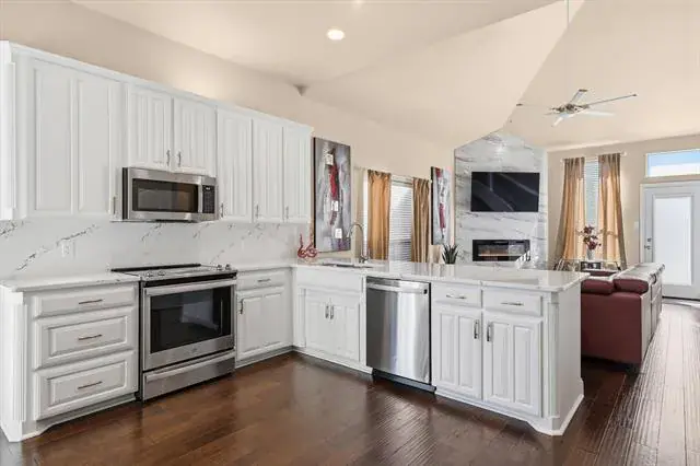 Welcome to 8308 Fall Crest Drive, a beautifully updated, single-owner home tucked within the award-winning Hurst-Euless-Bedford ISD. This residence features a one-of-a-kind layout for the Lakes of River Trails neighborhood, offering 4 bedrooms, 3 full baths, and 3 versatile living areas. A spacious bonus living room upstairs includes a full bathroom and closet, allowing it to function as a second primary suite or private guest retreat. From the moment you arrive, the ornate steel front door sets the tone for the craftsmanship and care that define this home. Inside, discover cathedral and vaulted ceilings, hand-scraped hardwood floors, and designer lighting throughout. The open-concept main level centers around a modern kitchen with custom white cabinetry, Cambria quartz countertops, stainless steel appliances, and a spacious eat-in area perfect for gatherings. The living room’s floor-to-ceiling electric fireplace creates a warm and sophisticated focal point for the space. Ideally located in the sought-after River Trails community, residents enjoy access to scenic lakes, fountains, and the Trinity River bike trails that connect to downtown Fort Worth. With quick highway access and just minutes from DFW Airport, AT&'T Stadium, and Globe Life Field, this home perfectly blends luxury, convenience, and lifestyle in one exceptional package. Roof less than 2 years old.