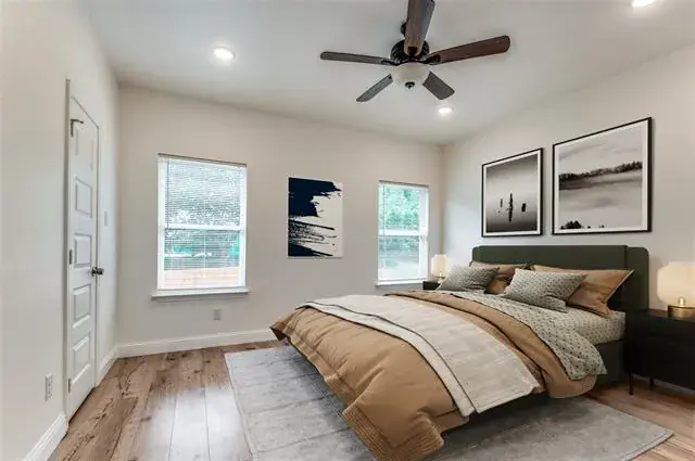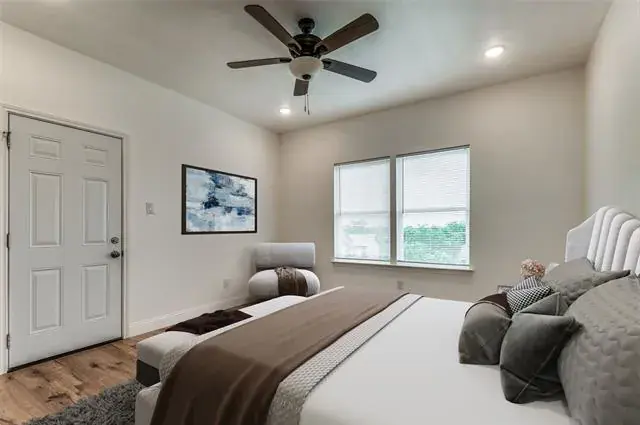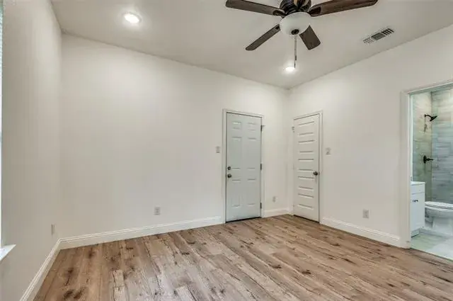 This home is perfect for roommates or an investor looking to rent by the room! Each bedroom has its own ensuite bathroom and access to the exterior of the property from each room. The four bedrooms accommodate king or queen-sized beds, ensuring ample personal comfort and your own retreat. The shared kitchen features plenty of cabinetry, a walk-in pantry, and island, it flows seamlessly into an inviting open living area as well for socializing. The added convenience of a guest half-bath on the lower level is a thoughtful design for guests. The crown jewel of the home is the second-floor patio, presenting a breathtaking view of Downtown Fort Worth. This home caters to the dynamics of shared living space many people are looking for.