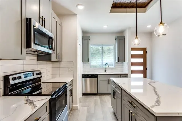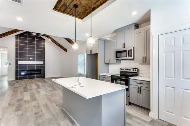 A Real Showstopper! This wonderfully designed new build is the perfect home with all the designer qualities plus much more. An entertainer’s dreams with an open floorplan offering soaring high ceilings plus beams and an architectural chic ceiling fan, a dazzling kitchen with an oversized island, tile plank flooring throughout. The massive floor to ceiling tiled wall with Napoleon electric fireplace is absolutely stunning! Home offers gorgeous quartz countertops, custom cabinetry, SS appliances and pantry along with true professional touches in both bathrooms. Primary bedroom offers customary tray ceilings and an enormous walk-in closet. Entirely energy efficient home. Enjoy the front and back porches for all your family gatherings. This is a true gem!