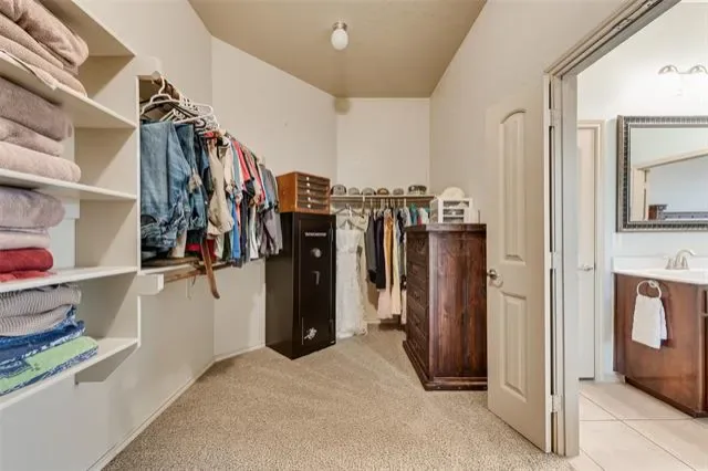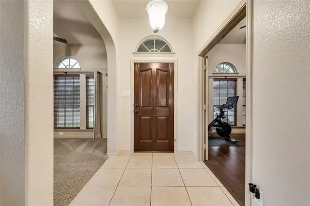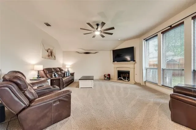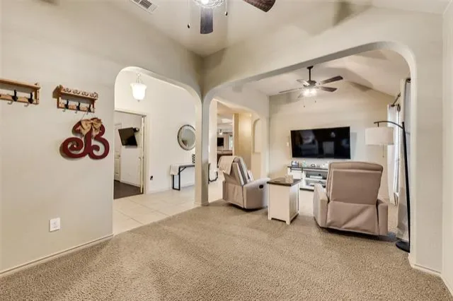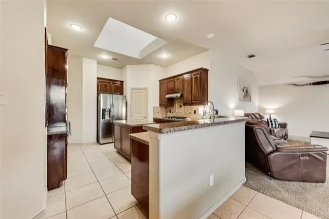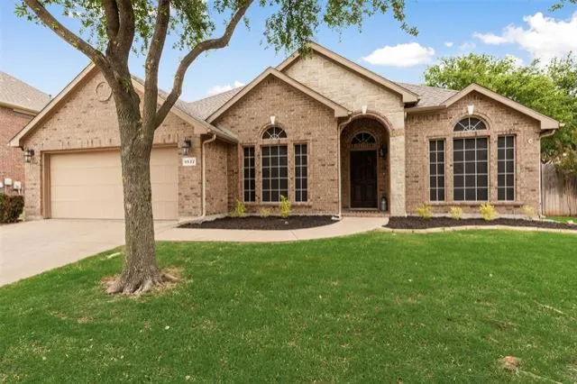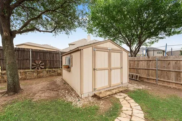 Beautifully maintained single-story home situated on an oversized lot in Liberty Crossing! This charming brick and stone exterior is complemented by mature trees and great curb appeal. Inside, you’ll find an open concept layout with high ceilings, oversized tile flooring, and two spacious living areas perfect for a flex space or home office. The island kitchen features abundant cabinetry, generous counter space, stainless steel appliances, and a skylight that fills the room with natural light. The private primary suite is thoughtfully split from the secondary bedrooms and offers a luxurious en-suite bath with dual sinks, a soaking tub, and a separate shower. Stylish paint colors enhance the home throughout. Enjoy outdoor living with a covered patio and additional storage building. Ideally located just minutes from Presidio and Alliance shopping.