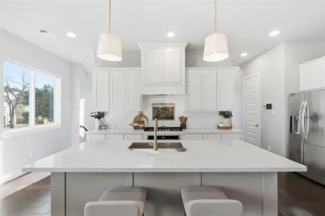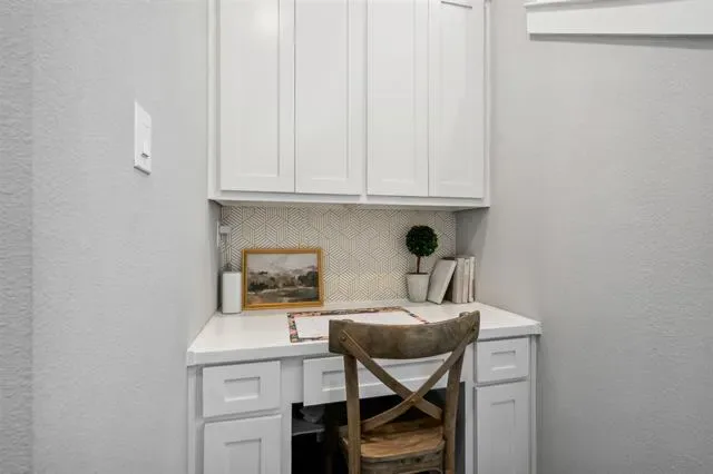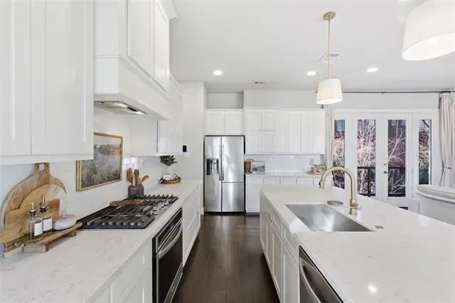 On the second level, you’ll find an open-concept living area designed for both everyday living and entertaining. The kitchen and living room showcase custom built-ins, designer lighting, a dedicated work area, and large windows that create a bright, airy feel. Double doors open to a private patio, extending your living space outdoors.