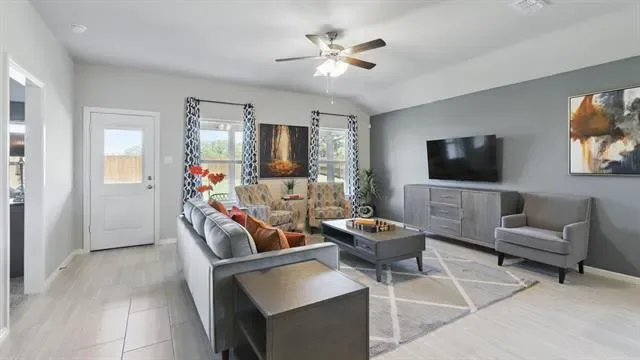 D.R. Horton America’s Builder since 2002 is excited to serve as your new home builder in Lonestar at Liberty Trails, a fabulous unique master planned community in Justin and Northwest ISD! The single-story Kingston Floorplan Elevation-B, with an estimated Summer completion, features 4 bedrooms, 2 bathrooms, and a 2-car garage. Designed for modern living, this home offers an open-concept layout connecting the family room, dining area, and chef-inspired kitchen, complete with a large seating island, granite countertops, stainless steel appliances, gas range, built-in microwave, and a wide pantry. The primary bedroom includes a walk-in closet and a bathroom with a wide quartz-topped vanity and a 5-foot oversized shower. Luxury vinyl flooring flows through the entry, hallways, and wet areas, and the home includes America’s Smart Home Technology package. Step outside to enjoy the covered back patio and a fully fenced backyard with sod and a sprinkler system, perfect for relaxing or entertaining. Future Community Amenities to include: Club House, Dog Park, Fishing Pond, Pickleball, Playground, Pool, Splash Pad, Walking-Nature Trails and Sand Volleyball. Situated conveniently near Highway 114 and Highway 287, Lonestar at Liberty Trails provides convenient access to key roads, making it ideal for commuting and exploring the surrounding areas.