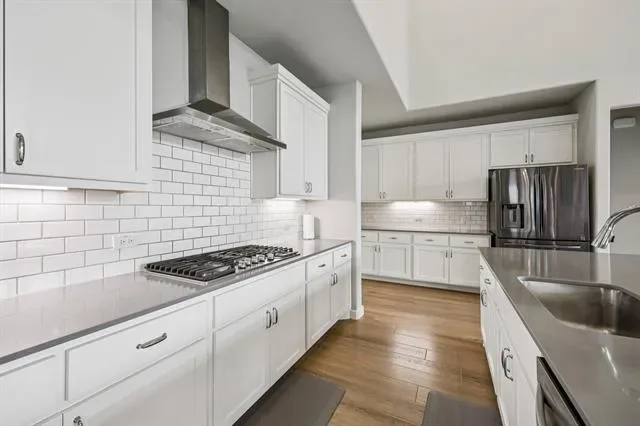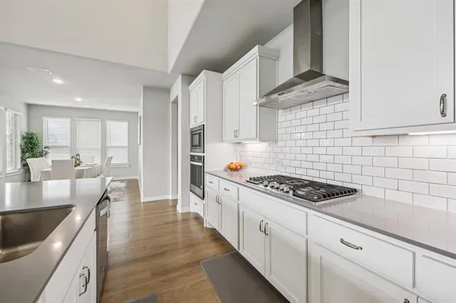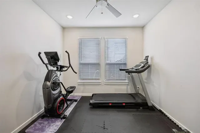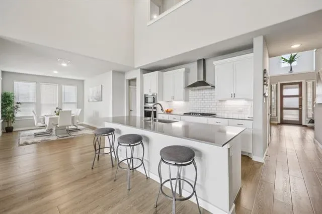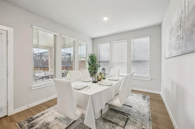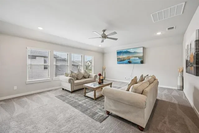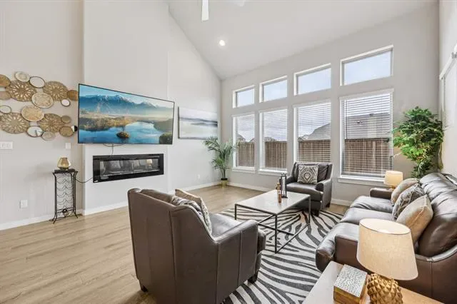 Situated on a spacious corner lot, this stunning Trophy Signature home offers exceptional curb appeal with a charming front porch that sets the tone from the moment you arrive. Step inside to soaring ceilings and a striking modern staircase, complemented by a versatile formal living or dining space at the front and a private office with French doors. The open-concept living area is filled with natural light and anchored by a sleek electric fireplace, seamlessly connecting to the chef’s kitchen. Designed for both everyday living and entertaining, the kitchen features white cabinetry, quartz countertops, a subway tile backsplash, stainless steel appliances, and a walk-in pantry. The spacious primary suite is downstairs and showcases a bay window along with a beautifully appointed ensuite bath offering dual vanities, an oversized shower with bench seating, and a walk-in closet. A downstairs guest bedroom and an oversized laundry room with space for a freezer add to the home’s thoughtful layout. Upstairs, you’ll find a large game room, dedicated media room perfect for movie nights, and three additional bedrooms—providing plenty of room for family and guests. Enjoy outdoor living on the covered patio overlooking the expansive backyard, ideal for entertaining or relaxing. The 3-car garage with wood doors adds both function and style. Residents also enjoy resort-style amenities including two amenity centers, a community pool, playground, and fire pit. This home truly has it all—schedule your showing today!