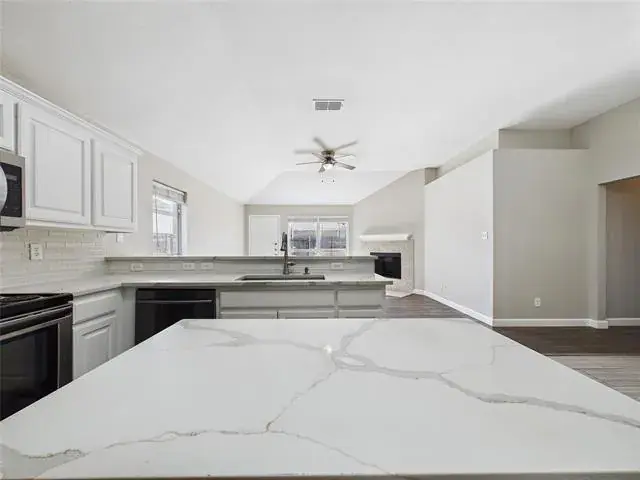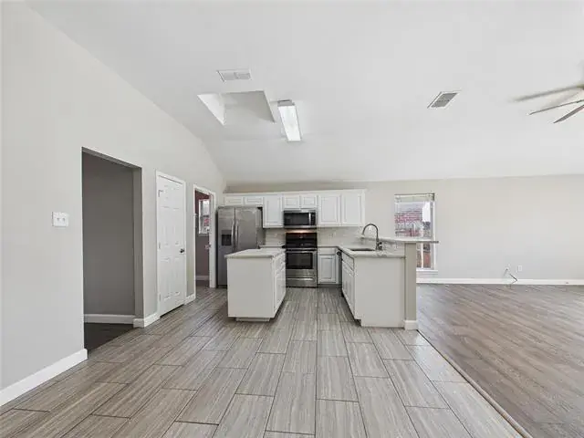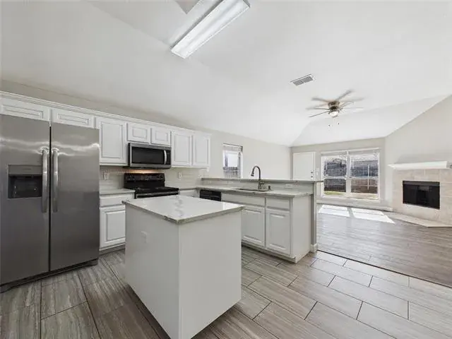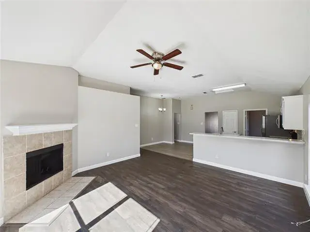 Inside, wood flooring carries through most of the main living areas, beginning in the dining space at the entry and continuing into the living room and hallways for a cohesive, welcoming feel. Porcelain tile defines the kitchen, adding durability and subtle separation while preserving the open flow. The living area features a vaulted ceiling and fireplace that anchor the space, with natural light filtering in through well placed windows.