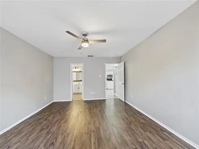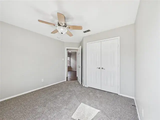 The kitchen is designed to stay connected to the heart of the home and includes quartz countertops with soft veining, stainless steel appliances, and bar seating along the peninsula, ideal for casual dining or gathering with guests. Bedrooms offer a mix of carpet and laminate flooring, while bathrooms are finished with ceramic tile.