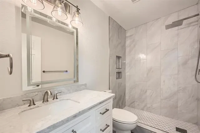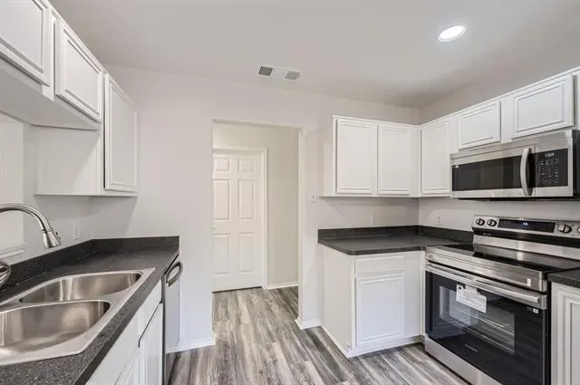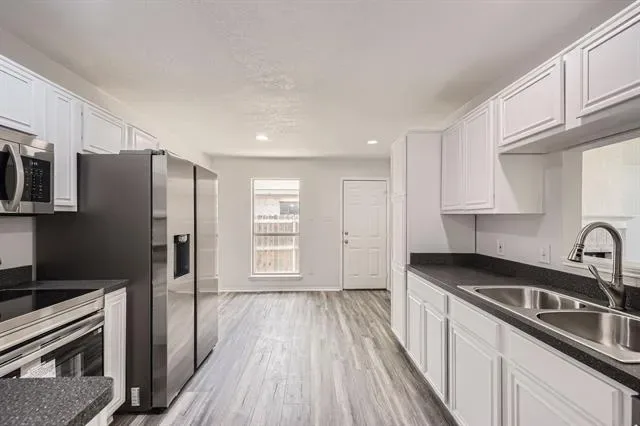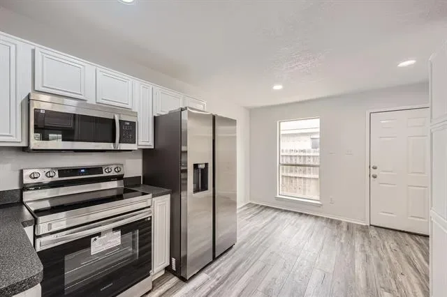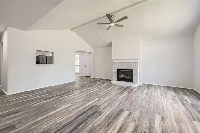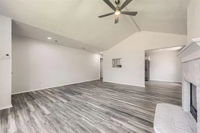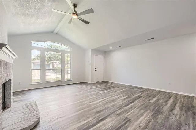 Complete Remodel- Move in Ready! Large Bedrooms w large closets. Beautiful tall ceiling in Living room vaulted with beam. New Flooring, New tile, new light fixtures, new bathrooms and much more. This 3 BR 2 Bath Gray Brick Home resides in a peaceful neighborhood. One story, gray brick home with beautiful painted exterior doors, located in quiet neighborhood & walking distance to elementary school. Brand new stainless steel appliances. New garbage disposal, new flooring throughout, sleek tile choices and updated plumbing fixtures, new vanities and new lighting w built in ceiling fans throughout. The home is 1405 Sf but due to design feels much larger. The chimney was professionally swept. The duct work in entire home has been cleaned. Two car garage includes opener and an insulated garage door. 3 year old roof, new central AC & heat, water heater less than 2 years old.. Fenced back yard with a small patio. Easy access to dining, shopping, stores and easy access to freeway and 26 minutes to DFW airport. Virtual Tour available. Make your best offer!