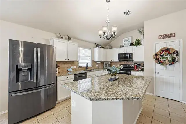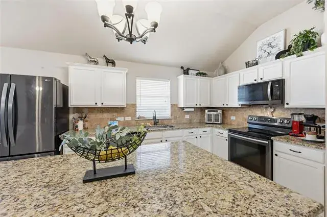Cable TV Available, Decorative Lighting, Eat-in Kitchen, Granite Counters, Kitchen Island, Paneling, Vaulted Ceiling(s)