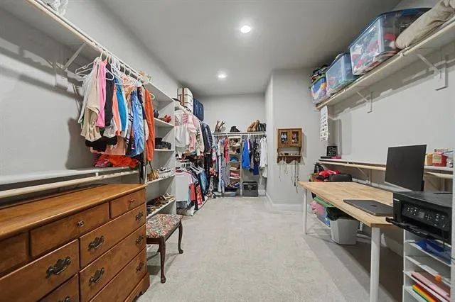 The primary suite is located on the first floor and features dual sinks, a garden tub, separate shower, granite countertops, and an oversized walk-in closet. A secondary bedroom and full guest bath are also conveniently located on the main level. Just off the entry, a private office or study with French doors and a closet offers flexibility for remote work or additional living space.