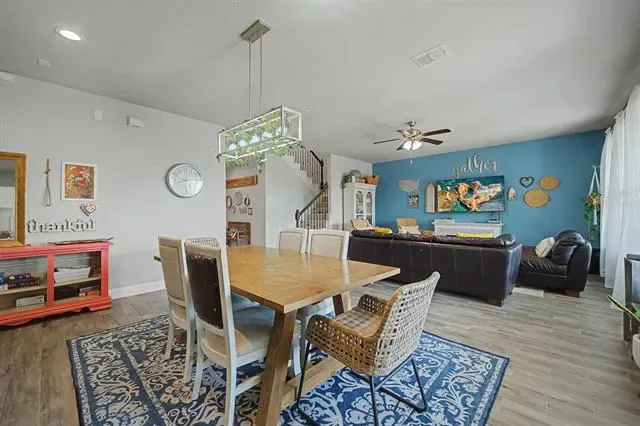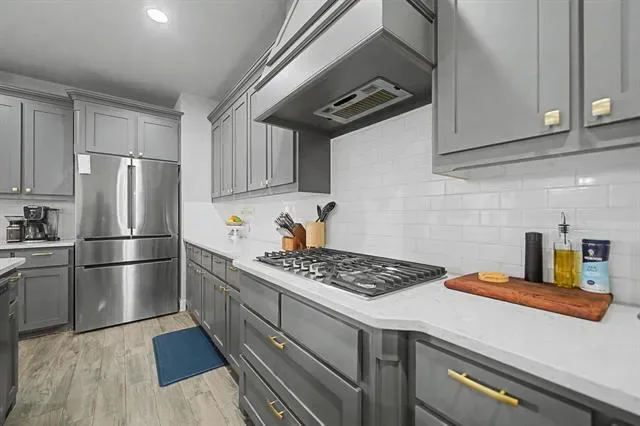 Built in 2019 and offering over 3,200 square feet of living space per tax records, the interior features wood-look ceramic tile and carpet throughout. The open-concept kitchen, living, and dining areas create one expansive space ideal for entertaining and everyday living. The kitchen is both stylish and functional, featuring gray-toned cabinetry with crown molding, granite countertops, and a full-length white subway tile backsplash. A five-burner gas cooktop with a custom built-in vent hood anchors the space, complemented by stainless steel appliances, including a counter-depth French-door refrigerator (negotiable). The oversized island provides additional storage and seating, making it perfect for casual dining, meal prep, and gatherings.