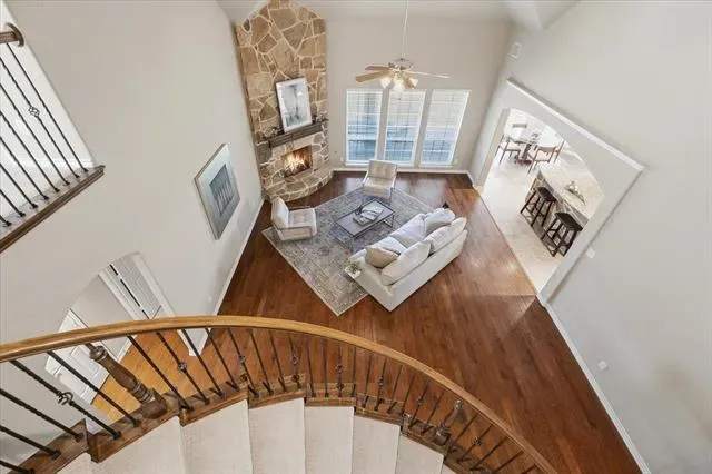 This charming home is nestled in one of north Fort Worth’s most beautiful neighborhoods. Upon entry on rich hardwood floors one is welcomed into an open floorplan with wonderful architectural detailing which includes a floor to ceiling, stone accented fireplace and an elegant curved staircase. An immediately notable quality of this house is the well appointed gourmet kitchen with custom wood cabinets, granite tops, stainless appliance package, gas cooktop and a cozy breakfast space that looks over the lush backyard. The private owner’s retreat boasts a step up tray ceiling and ensuite bath with separate shower, garden tub, duel vanities and large walk in closet. The focal, curvilinear staircase in the living room leads to an informal family space with an adjacent media room. Also upstairs are four generously sized bedrooms and two full bathrooms. Additional interior features include an inconspicuous walk in pantry and a butler’s pantry connecting the kitchen to a formal dining room. Not to be overlooked is a well appointed office with warm, natural light focused on the front yard. Backyard offers a deep covered patio for outdoor entertaining and plenty of yard space for activities. Community amenities include pools, playgrounds, parks, walking trails, boat dock on Marine Creek Lake. Convenient access to Loop 820, Eagle Mountain Lake & Downtown Fort Worth. Buyer to verify schools, taxes and square footage.