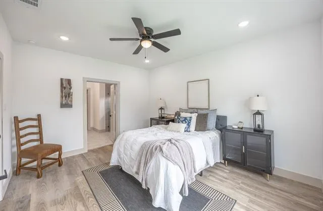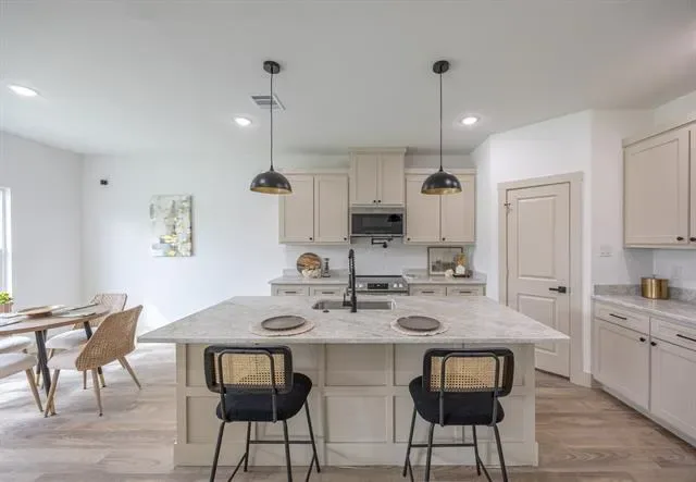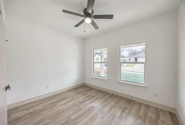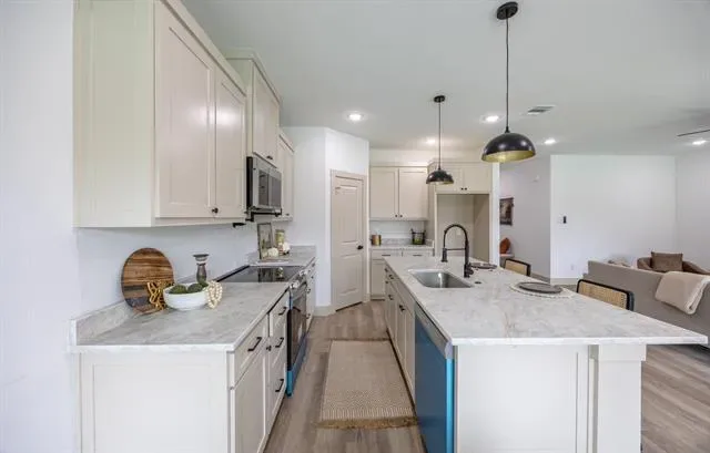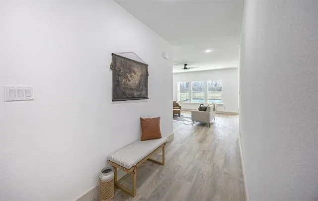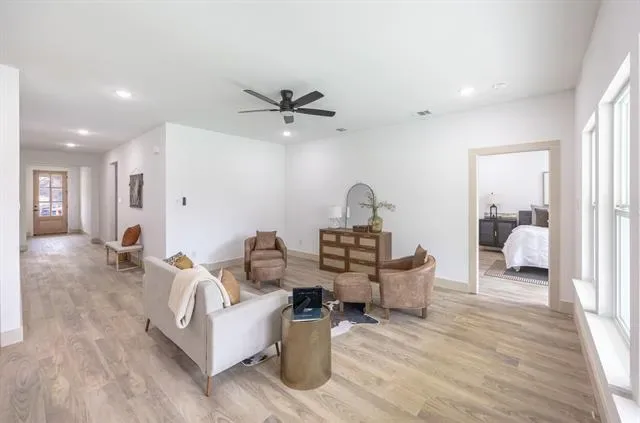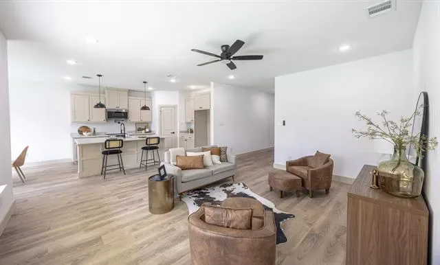 Welcome to this thoughtfully designed single story home featuring clean lines, quality craftsmanship, and modern finishes throughout. The inviting exterior showcases board-and-batten siding, brick accents, a welcoming covered entry. Inside, you’ll find an open concept layout with luxury vinyl plank flooring, high ceilings, recessed lighting, and abundant natural light. The spacious living area flows seamlessly into the designer kitchen, complete with a large island, quartz countertops, custom cabinetry, stainless steel appliances, stylish pendant lighting, and ample storage perfect for entertaining and everyday living. The private primary suite offers a relaxing retreat with a ceiling fan, generous space, and a spa inspired ensuite bathroom featuring dual vanities, modern fixtures, a large walk in shower with frameless glass, and elegant tile finishes. Secondary bedrooms are well sized and thoughtfully laid out for flexibility.Additional highlights include energy efficient features, modern lighting throughout, a dedicated laundry area, and an attached two car garage. Conveniently located near major highways, shopping, dining, and downtown Fort Worth.