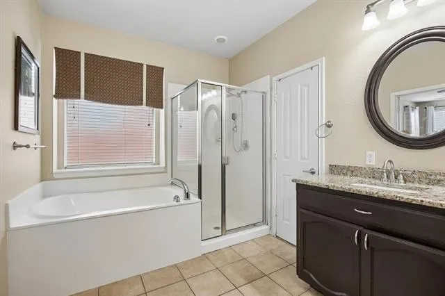 The spacious primary suite offers room for a sitting area and abundant natural light, along with an en-suite bath featuring dual vanities, extensive counter space, a soaking garden tub, separate walk-in shower, and a large walk-in closet.