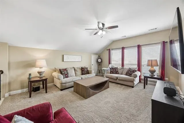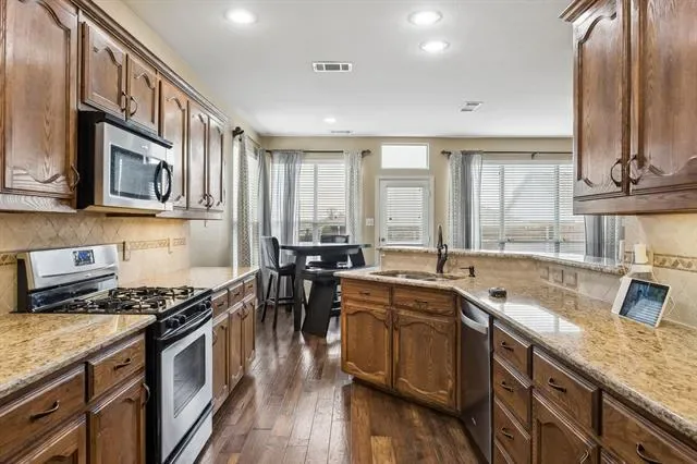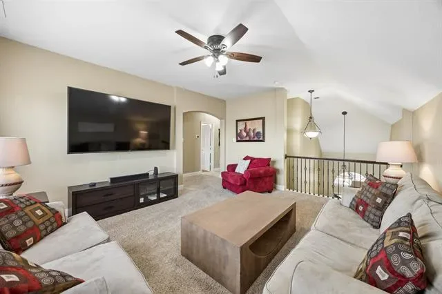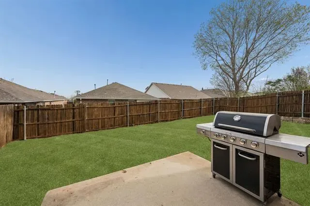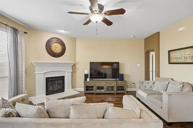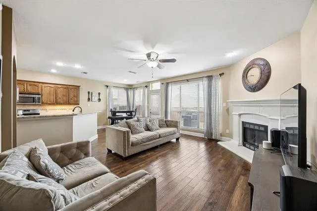 Welcome to this beautifully updated 4 bed, 2.5 bath home in the highly sought-after McPherson Ranch community, zoned for highly acclaimed Northwest ISD, and offering great curb appeal with lush landscaping. Inside, a light-filled open layout features rich hardwood flooring, recessed lighting throughout, and expansive windows. The living area flows seamlessly into the dining space, creating an ideal setup for both everyday living and entertaining. A cozy decorative corner fireplace with a classic white mantel adds warmth and charm to the living room.