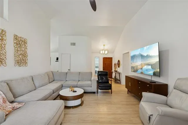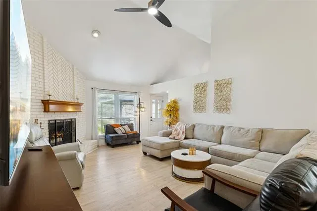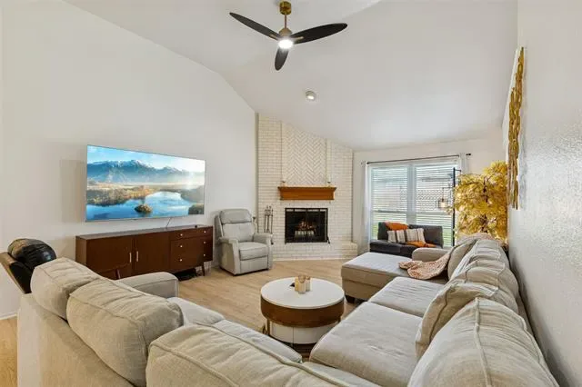 The main living area features soaring ceilings and a wood burning fireplace, creating a central gathering space that transitions into an updated kitchen anchored by abundant counter space, stainless steel appliances and a pantry for added storage. The open flow connects living and dining areas. Buyers comparing single story homes in south Fort Worth may appreciate the established neighborhood setting combined with thoughtful interior updates.