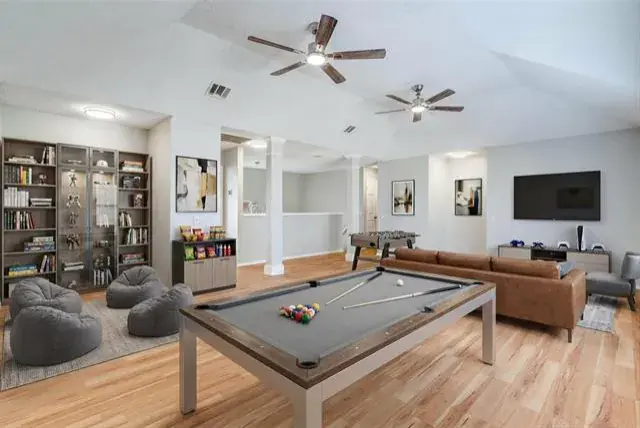 Welcome to this lovely two-story residence. This home boasts an open floor plan with two living and dining areas, creating an inviting space for entertaining or relaxing. The spacious upstairs game room, complete offers a perfect spot for leisure activities. With four bedrooms and 2.5 baths, this home provides ample space for everyone. The living area features a cozy fireplace, perfect for those chilly evenings. The primary suite, located downstairs, offers a private retreat with a separate tub and shower. The entire home is adorned with stylish laminate floors. Outside, a large fenced yard awaits, offering a great outdoor space for recreation and entertaining.