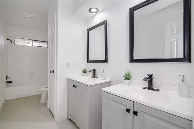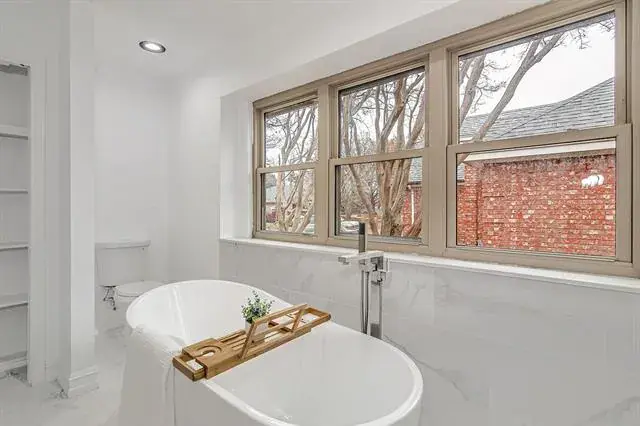 The primary bedroom includes an ensuite bath with a freestanding soaking tub, walk-in shower with contemporary tile, dual-sink vanity, and updated fixtures, creating a spa-like retreat. Secondary bedrooms are well-sized and versatile for guests, office, or flex space.